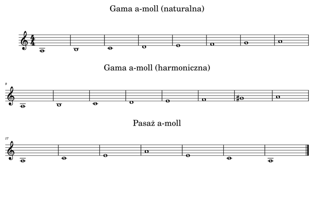 2. Gama a-moll i pasaż – siostrą gamy C-dur jest gama a-moll, którą najczęściej spotykamy w dwóch postaciach: harmonicznej i naturalnej, różniących się jedynie szóstym stopniem gamy.